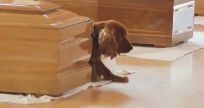 Në pamjet prekëse të publikuara nga mediat italiane, siç e transmeton Shekulli, shfaqet një qen i cili qëndron pranë arkivolit të të zotit dhe nuk dëshiron të largohet prej andej.