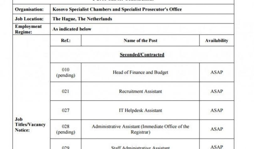 52 pozita të lira të punës, më përshkrimet përkatëse, janë publikuar në konkursin e Gjykatës Speciale në Hagë, e cila do të gjykojë rastet nga Kosova.