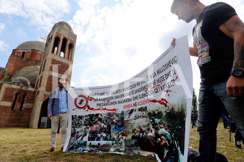 Studentët para kishës kanë shpalosur një pllakat të madh të madh në të cilin shkruan: “Kërkojmë që objekti i vendosur me dhunë nga Millosheviqi në kampusin universitar të shndërrohet në muze dhe të prezantohen masakrat dhe gjenocidi që i ka kryer Serbia në Kosovë”.