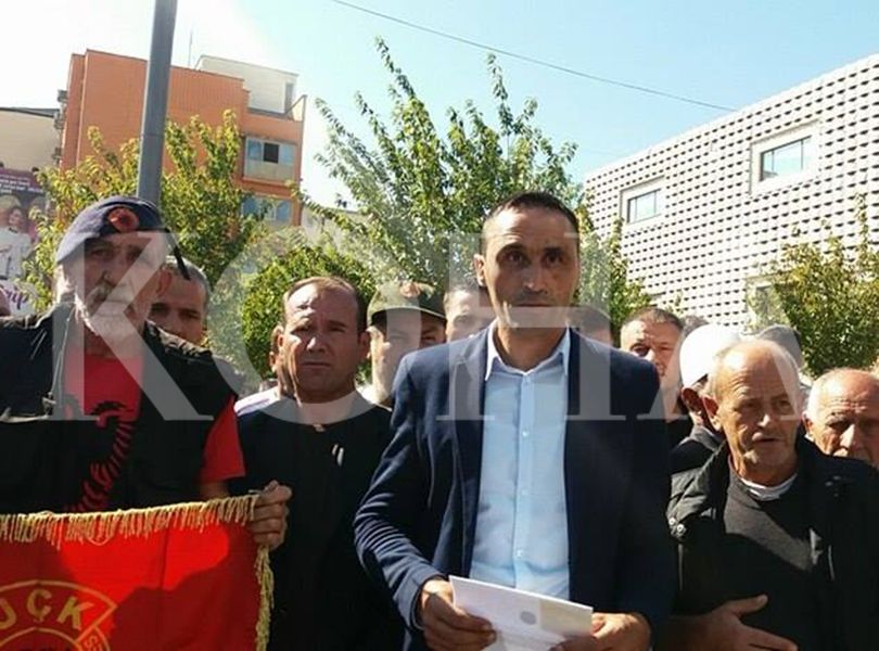 Kërkesat e veteranëve janë shkruar në një pankartë.