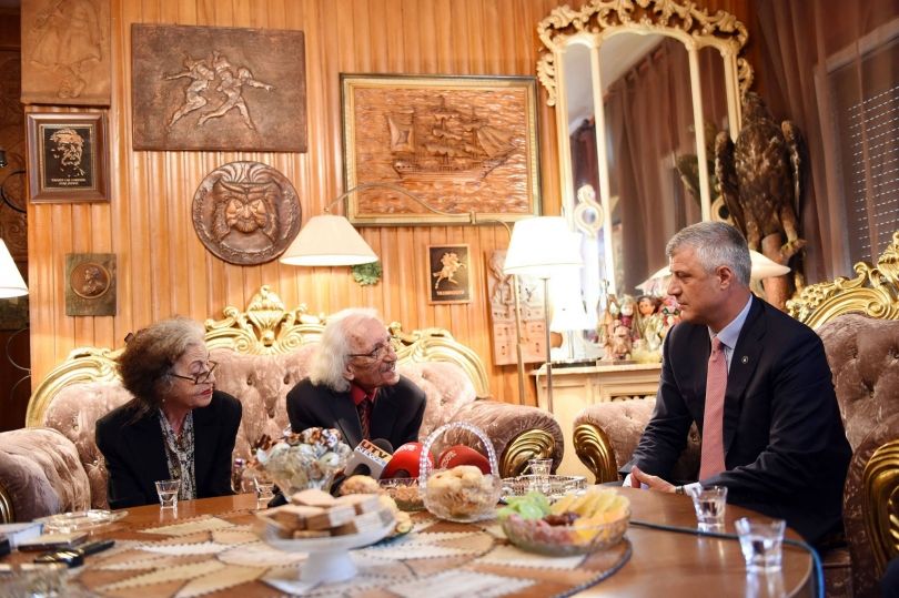 Dritëro Agolli: Gëzuar! Ju mos më lini të flas shumë se plaku bëhet i mërzitshëm. Hashim Thaçi: Është kënaqësi për mua që kam ardhur për t’iu uruar datëlindjen e 85. Unë ju uroj jetë të gjatë juve dhe familjes tuaj. Respekt për Sadijen, bashkëshorten tuaj që ju ka qëndruar afër gjithmonë, për kujdesin që ka treguar. Unë e di se jam para gjeniut të letrave shqipe dhe jo vetëm. Ato që ke shkruar kanë qenë frymëzim për të gjithë gjeneratat në Kosovë në vitin ’68 për lirinë e Kosovës, në vitin ’81 në protestat për Republikën e Kosovës edhe në demokraci. Në fillim të viteve ’90 ia keni thënë të vërtetën qytetarëve në Shqipëri për tranzicionin demokratik që ka kaluar vendi.
