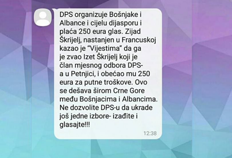 Në përmbajtjen e mesazhit, të cilin e ka bërë publik Nimanbegu thuhet: "Partia Demokratike e Socialistëve (DPS e Milo Gjikaniviqit v.j.) po i organizon boshnjakët, shqiptarët dhe diasporën dhe e paguan votën 250 euro. Zijad Shkreli me banim në Francë, i ka thënë “Vijestit” që e ka telefonuar Izet Shkreli që është anëtar i Këshillit Lokal në Petnjcë dhe i ka premtuar 250 euro dhe mbulimin e shpenzimeve të udhëtimit. Kjo po ndodh në krejt Malin e Zi në mesin e boshnjakëve dhe shqiptarëve. Mos lejoni që DPS-i të vjedhë edhe këto zgjedhje prandaj dilni në votime!"
