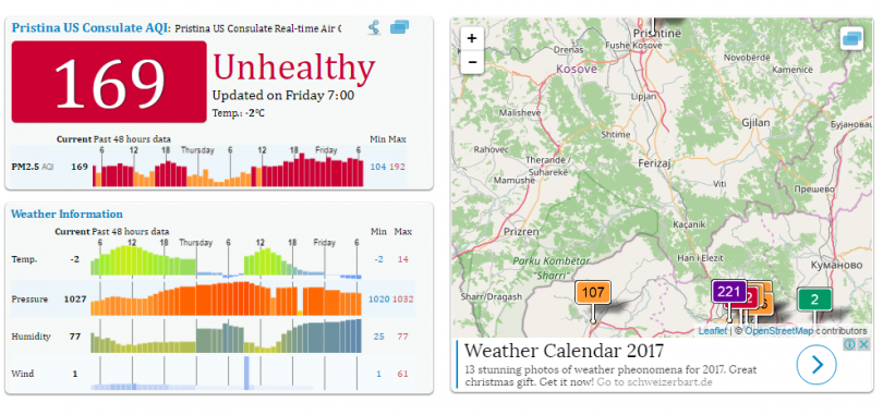 Kur mëngjesin e sotëm temperatura shënonte deri në -8 gradë celsius, si për inat edhe ajri tregonte nivel shumë të lartë të ndotjes. Kur i ftohti dhe ajri i ndotur, të dy me rezultatet mbi normalet, shkaktojnë efekte serioze në shëndet.
