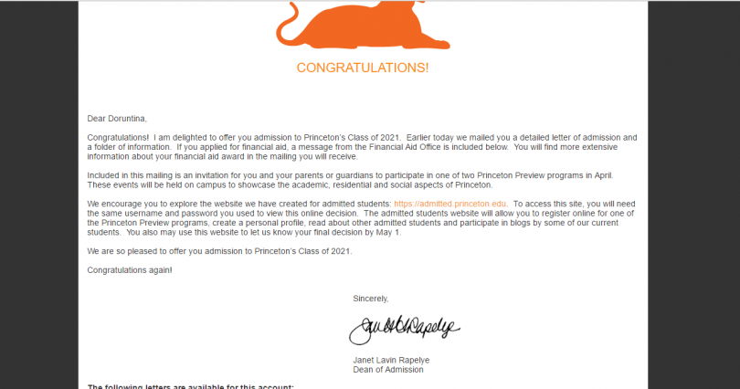 Doruntina është e pasionuar pas matematikës dhe ka potencial e talent të madh për këtë fushë, andaj pranimi i saj në Princeton University do t’i mundësojë asaj përmbushjen e pasionit dhe realizimin e potencialit dhe talentit të saj për matematikë.