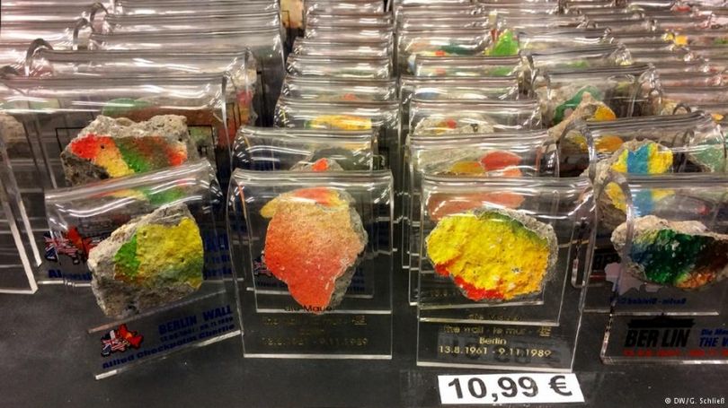 Sarah, e cila ka ardhur në vizitë nga Suedia, është duke u lëshuar teposhtë bulevardit “Unter den Liden” në Berlin me të ëmën dhe mendon se është “cool” të marrë me vete një pjesë nga Muri i Berlinit. Sikur të ishin gurë të çmuar, copat janë mbyllur në qese plastike. Çmimet sillen nga 6.99 euro deri në 23.99 euro. Asnjë prej këtyre copave të vogla nuk janë prerë me butësi. Ato janë të mprehta, sikur të ishin thyer nga muri.