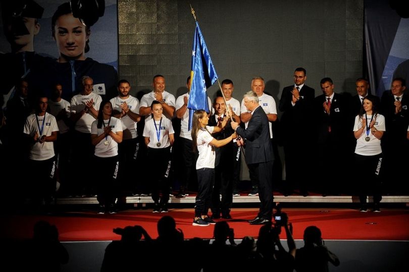 Ai i dorëzon flamurin e Kosovës, kampiones së dyfishtë të botës në xhudo, Majlinda Kelmendi, e cila katër vite më parë garonte për Shqipërinë, tani ai do të mbajë flamurin e Kosovës në hapje të Lojërave.