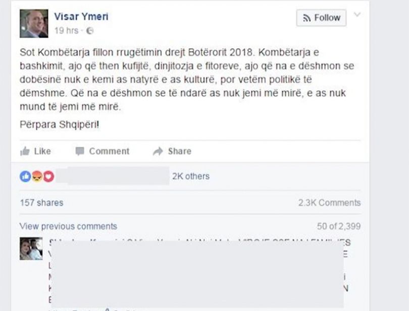 Një postim në Facebook i kryetarit të Vetëvendosjes, Visar Ymeri, kushtuar në tërësi kombëtares së shtetit fqinj, Shqipërisë, është pasuar me mbi 2 mijë komente, shumë nga to kritikuese, për faktin se kishte harruar debutimin historik të Kosovës. Ymeri nuk është tërhequr: të martën është rikthyer edhe njëherë në Facebook, duke insistuar se shqiptarët, duhet të kenë një kombëtare të përbashkët.