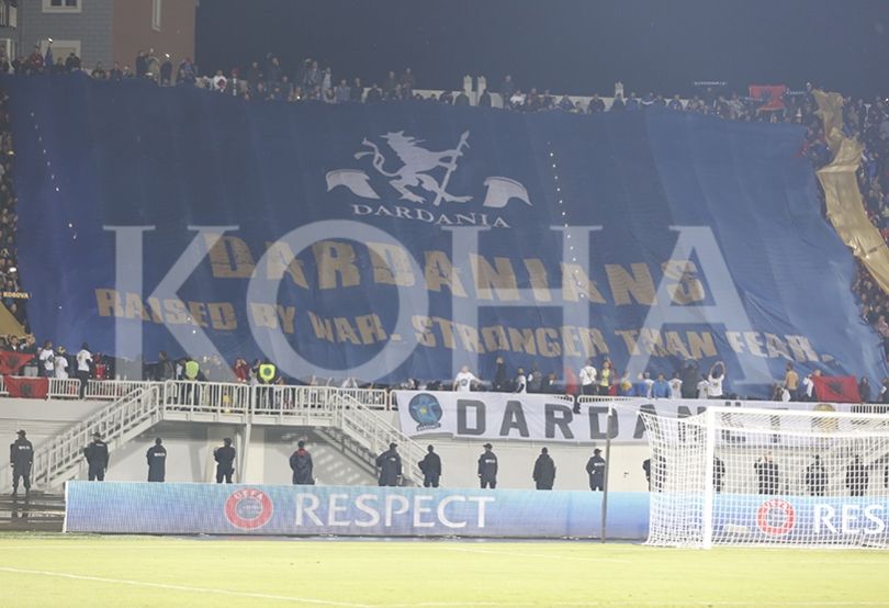Në të shkruhet “Dardanët, të rritur në luftë. Më të fortë se frika”, përderisa mbi këtë shkrim janë edhe dy helmeta dardane dhe një luan në mes, duke mbajtur në shtizë.