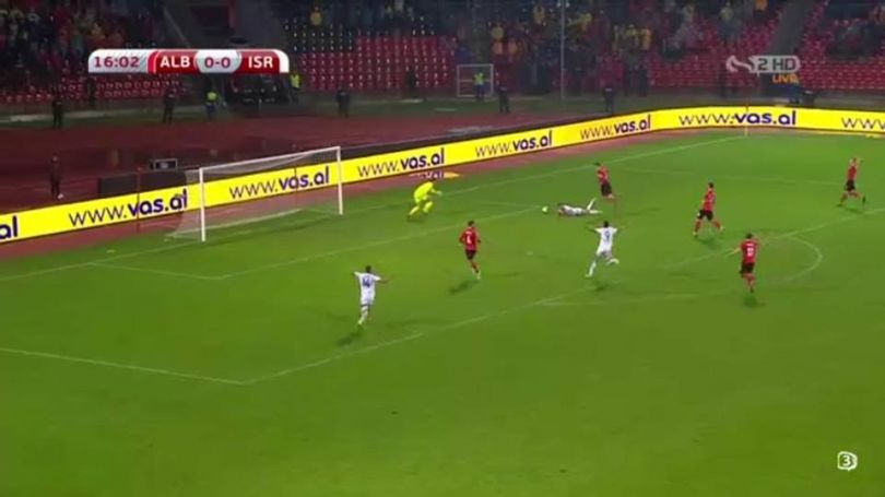 Izraeli e mposhti Shqipërinë me rezultat prej 0-3, dhe Gjimshiti shkaktoi penaltinë që i siguroi epërsinë e parë ekipit mysafir. Me këtë rast ai u përjashtua nga loja.
